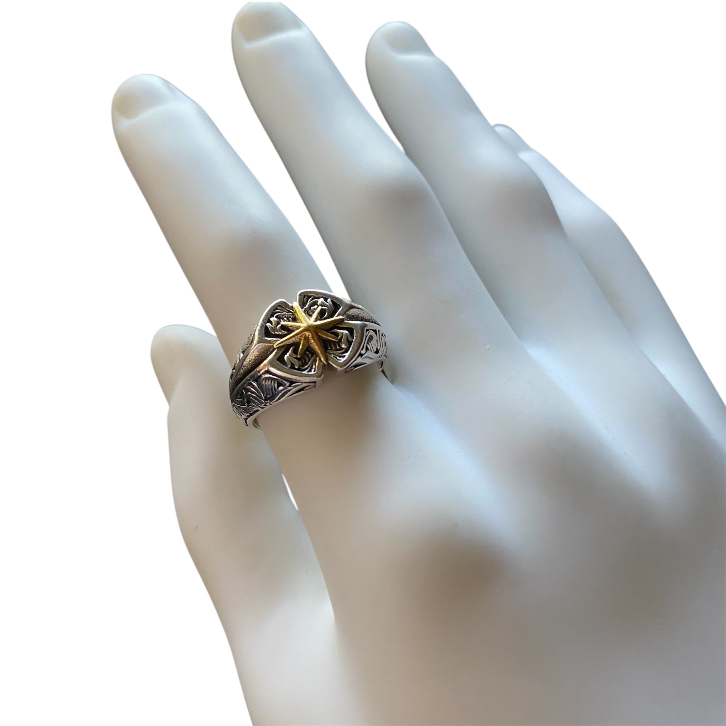 夜空で静かに輝き続ける「北極星(Polaris)」をモチーフにしたリング。中央に装飾された星は、どんな時も道を示し続ける光を象徴しています。全体に装飾が施されており、デザイン性の高いアイテムです。